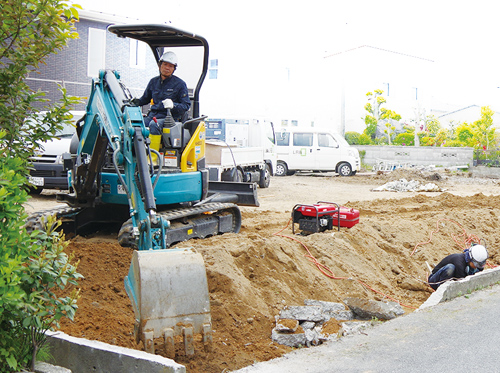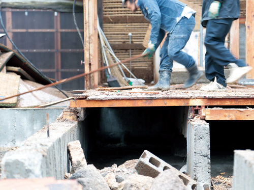 解体作業中は、廃材の分別・収集をしながら作業を進め、搬出を行います。家屋の解体が終わったあと、地中に、廃材や異物が残っていないかを確認します。弊社では、丁寧・安全・スピーディーを原則に解体工事を行わせていただいております。